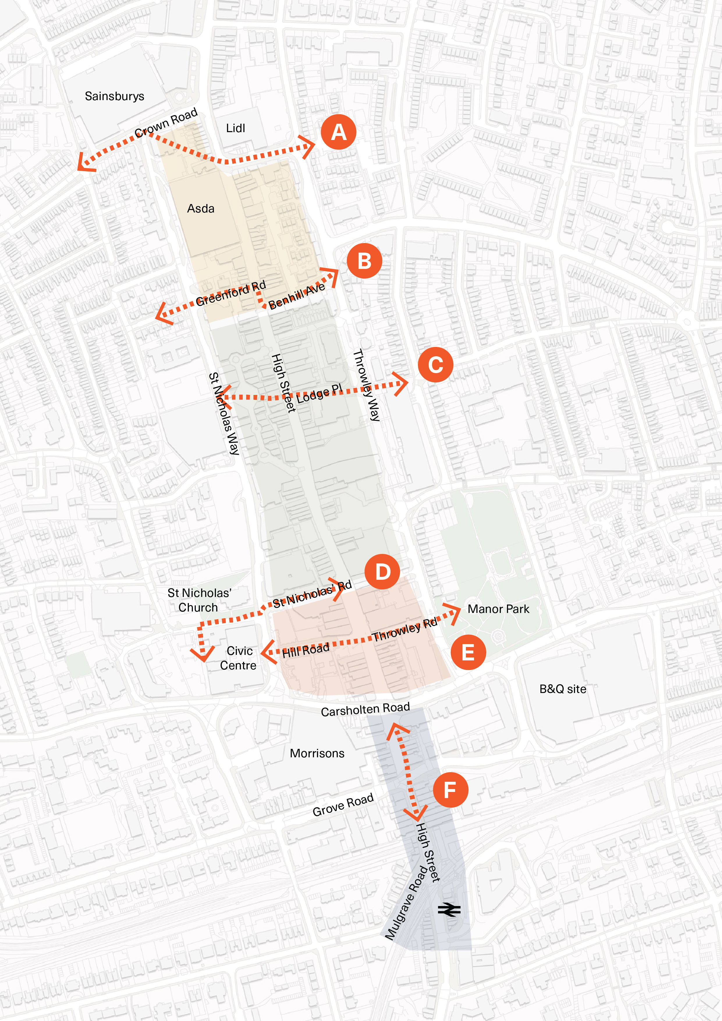 The map below shows six key routes that could improve how people travel into and around Sutton Town Centre - whether on foot, by bike, or by vehicle.